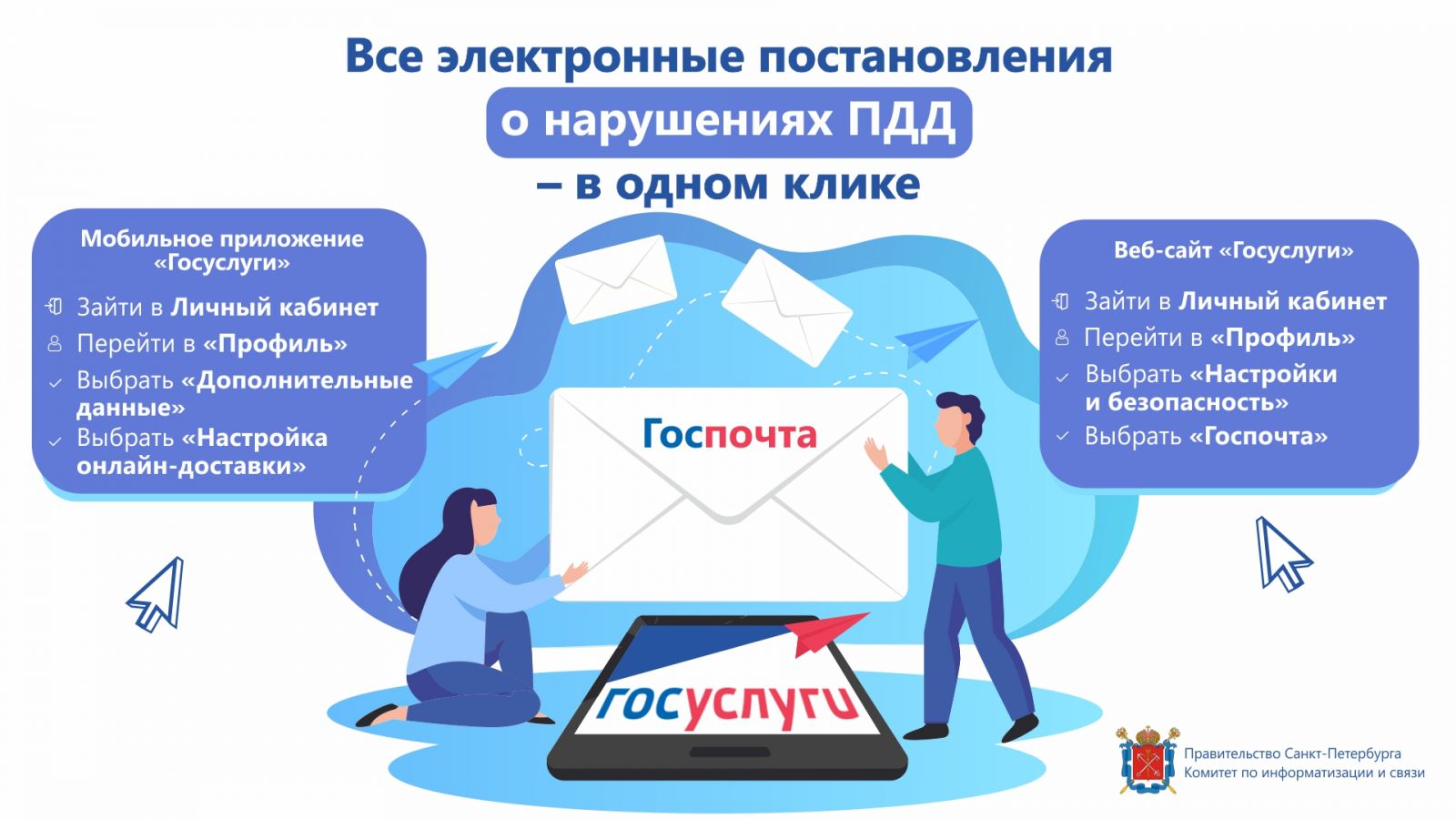 На веб-сайте Госуслуг необходимо зайти в Личный кабинет, перейти в «Профиль» и в разделе «Настройки и безопасность» выбратькатегорию «Госпочта». Все письма хранятся в Личном кабинете портала Госуслуг, и их можно прочитать в любое удобное время. Автовладелец в любой момент может посмотреть, распечатать или оспорить постановление о нарушении ПДД. При смене места жительства либо проживании не по месту регистрации можно не бояться пропустить важное письмо – оно всегда будет доступно на электронной почте и в Личном кабинете портала Госуслуг. Вся информация о нарушениях ПДД и проезжающем автотранспорте с комплексов фотовидеофиксации передаётся в ЦАФАП в ОДД ГИБДД ГУ МВД России по СПб и ЛО.