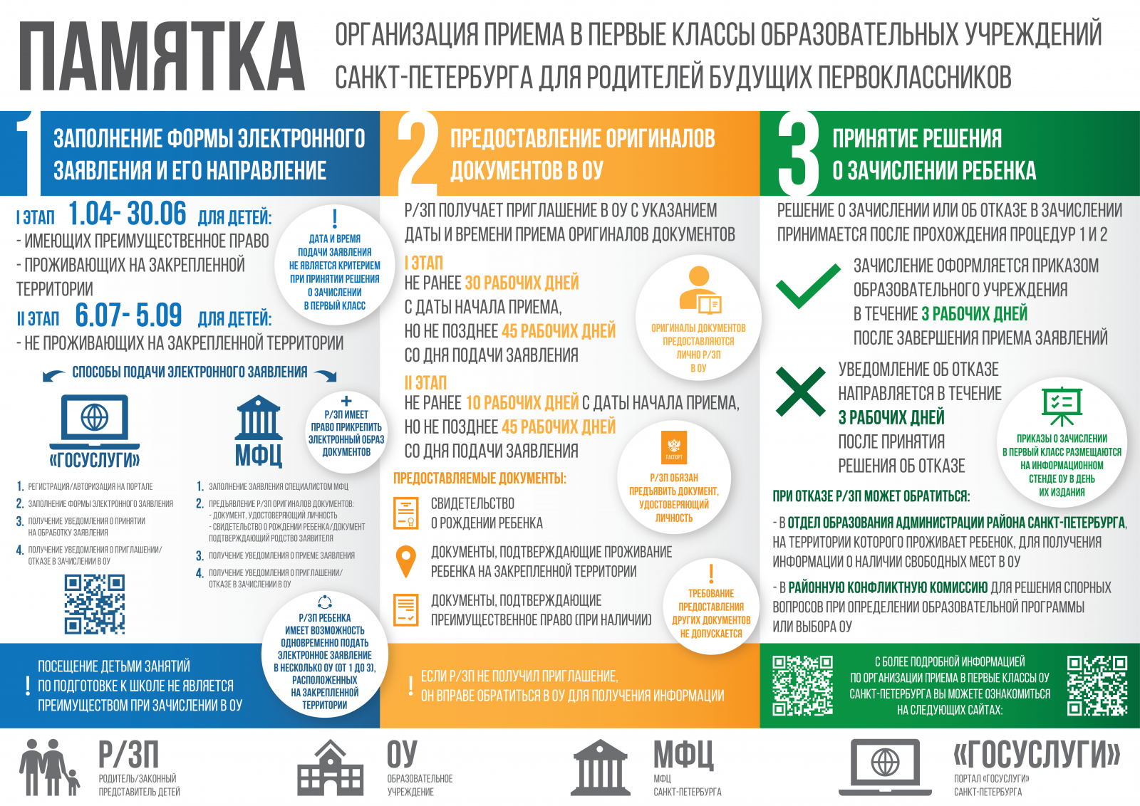 - Распоряжение Комитета по образованию от 31 марта 2021 года N 879-р «Об утверждении регламента образовательных организаций, реализующих образовательные программы начального общего, основного общего и среднего общего образования, находящихся в ведении исполнительных органов государственной власти Санкт-Петербурга, по предоставлению услуги по зачислению в образовательные организации, реализующие образовательные программы начального общего, основного общего и среднего общего образования»;